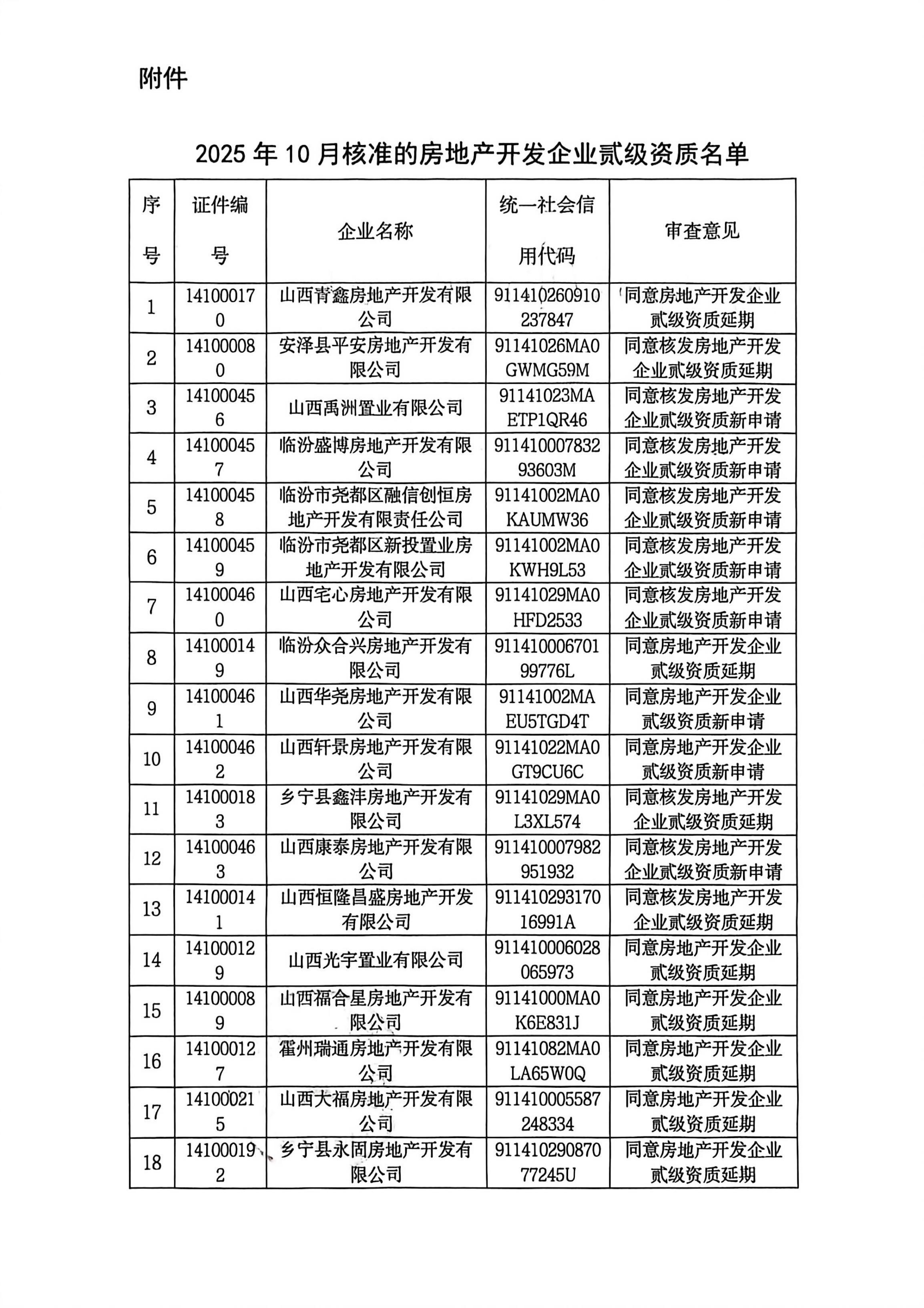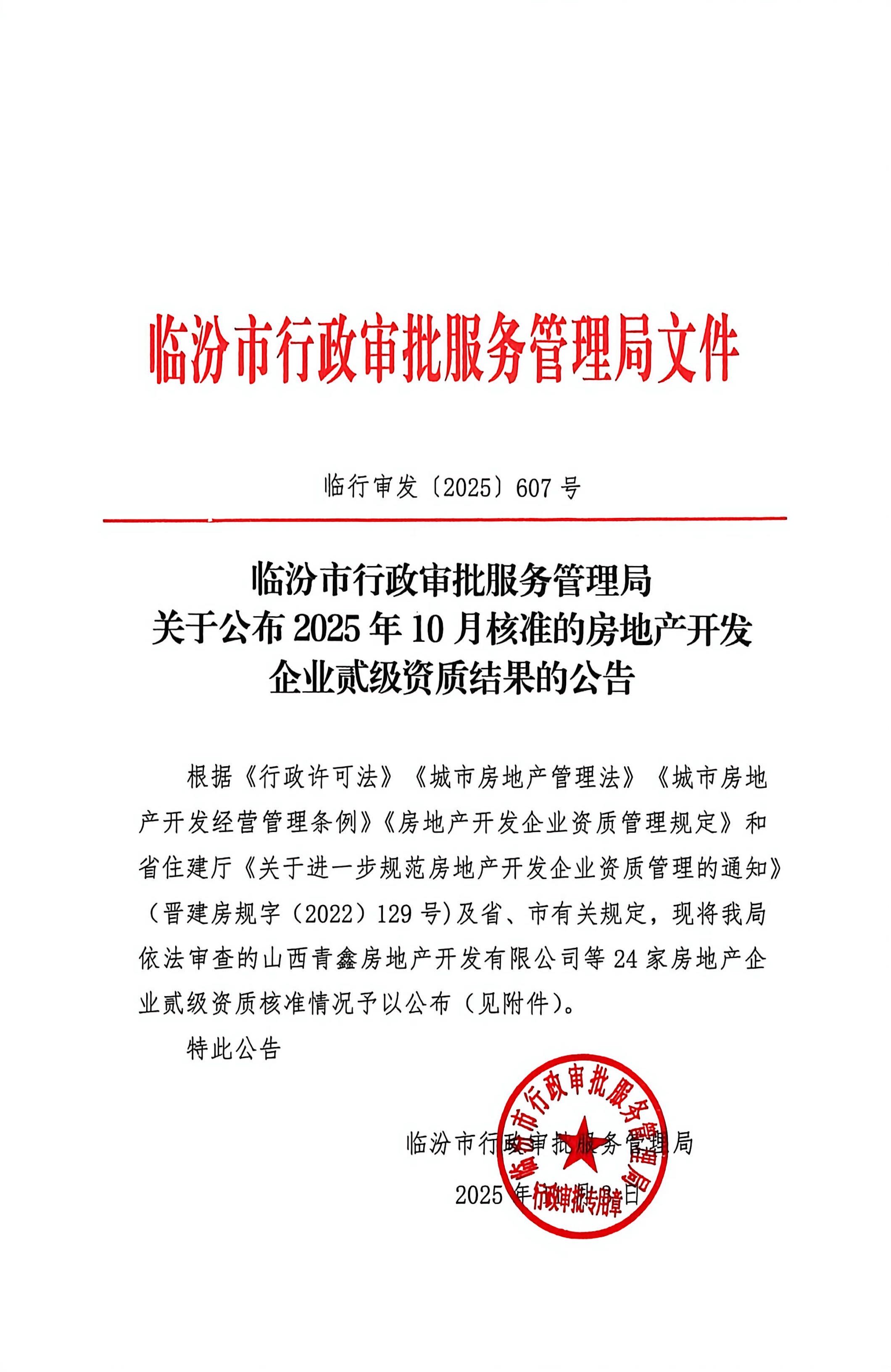 临汾市行政审批服务管理局关于公布2025年10月核准的房地产开发企业贰级资质结果的公告