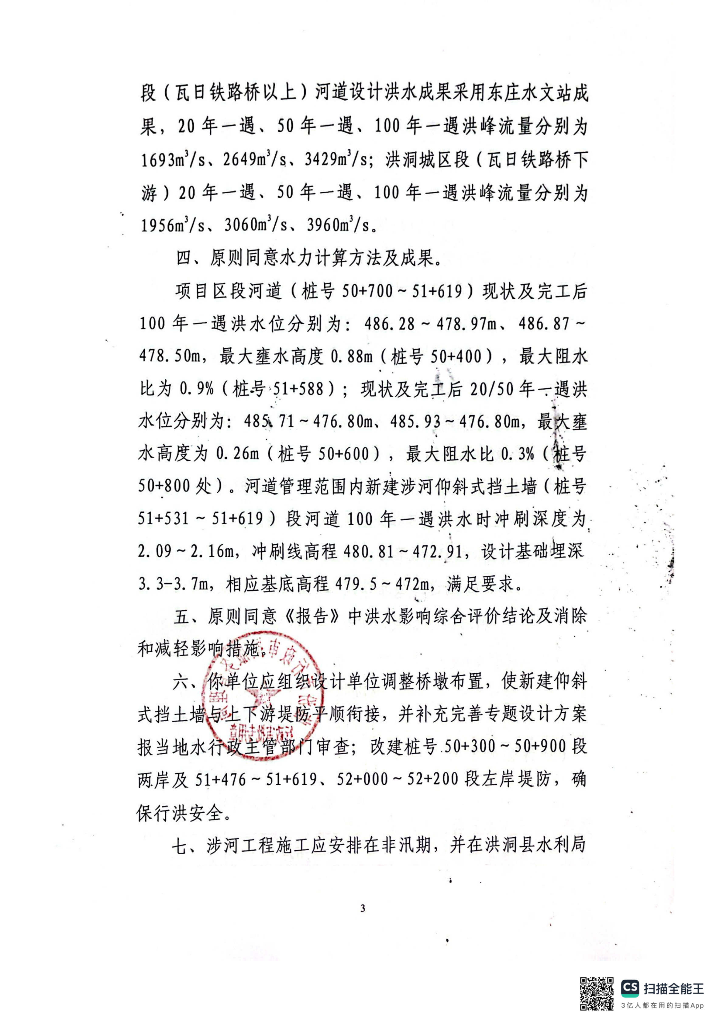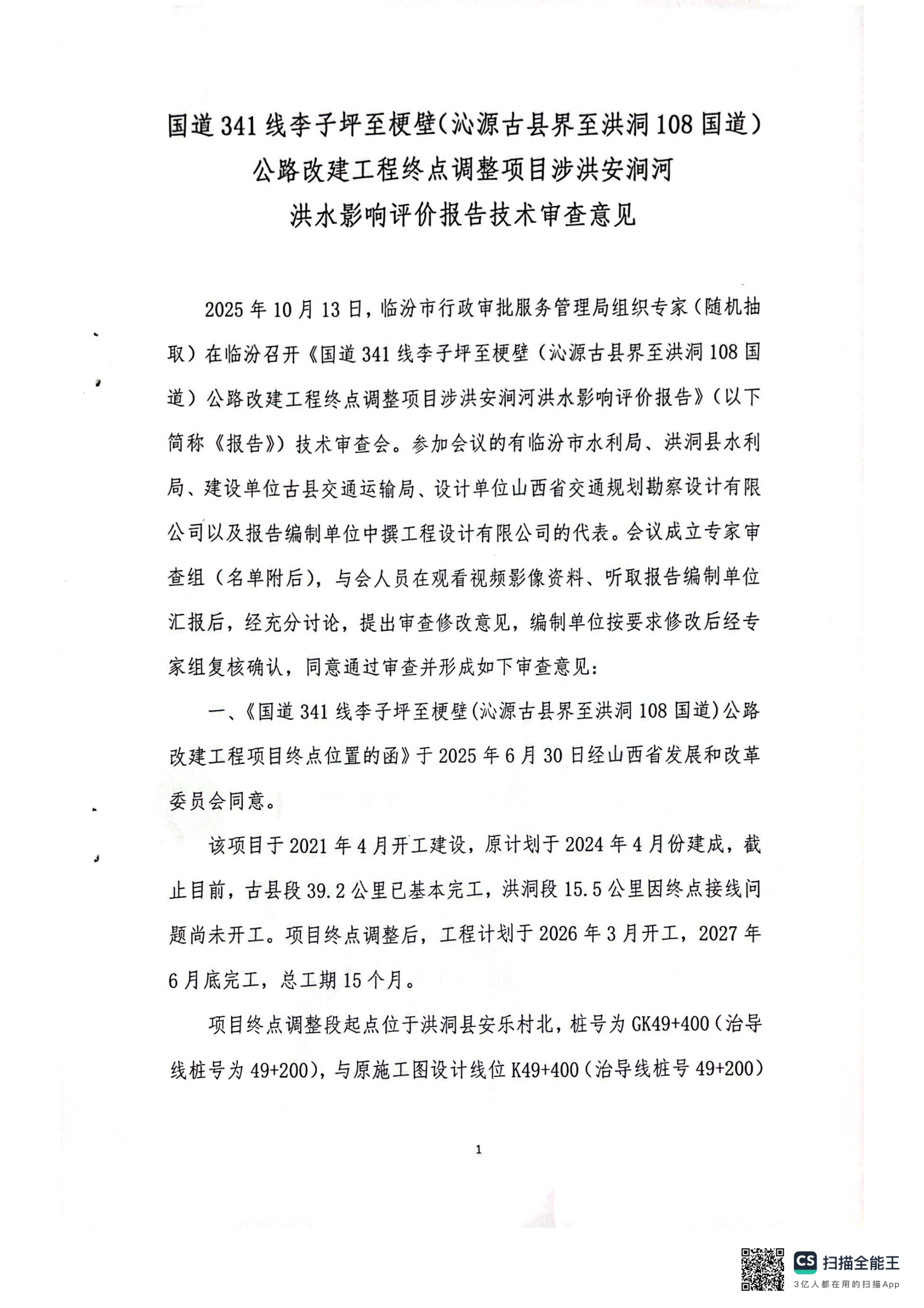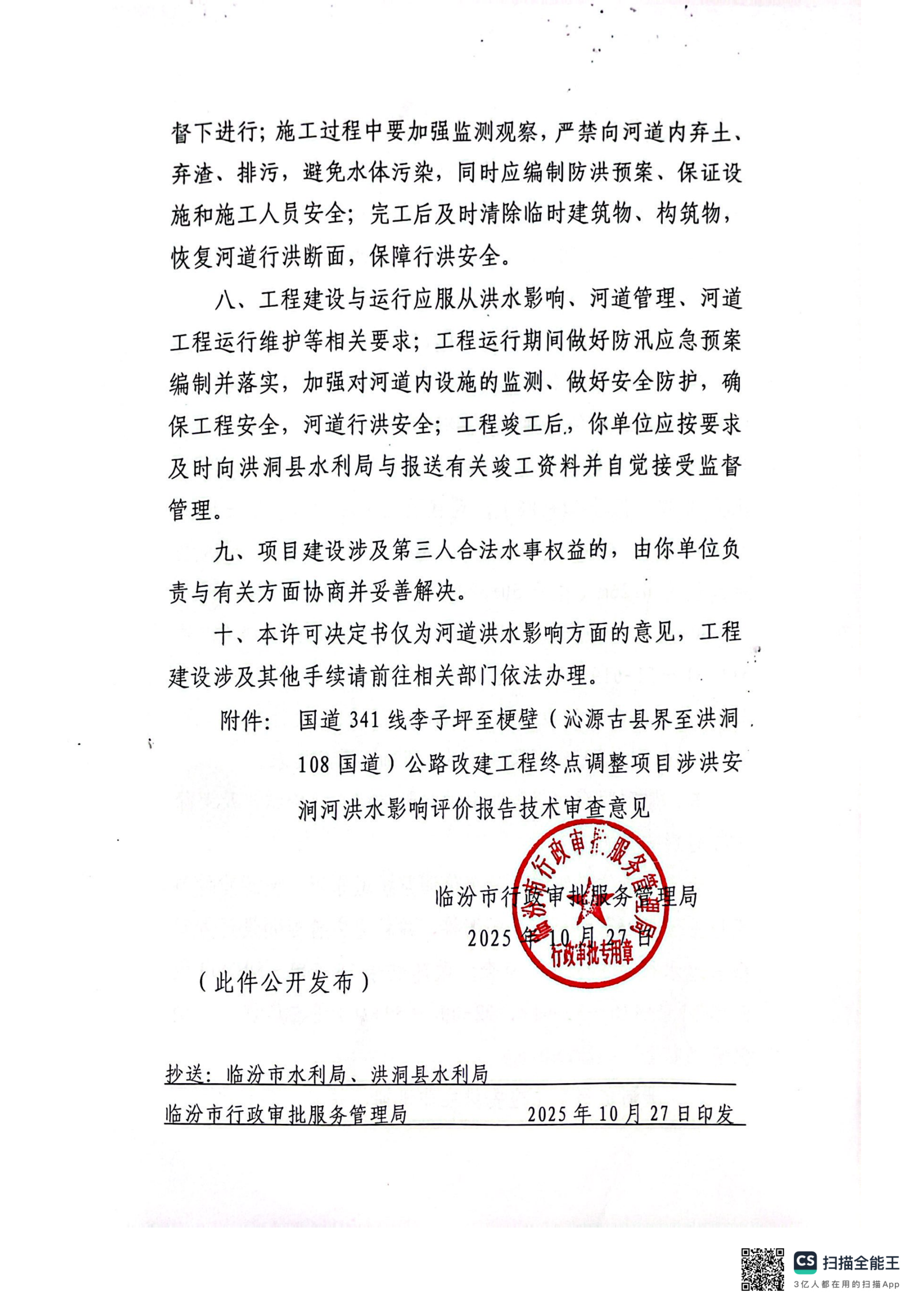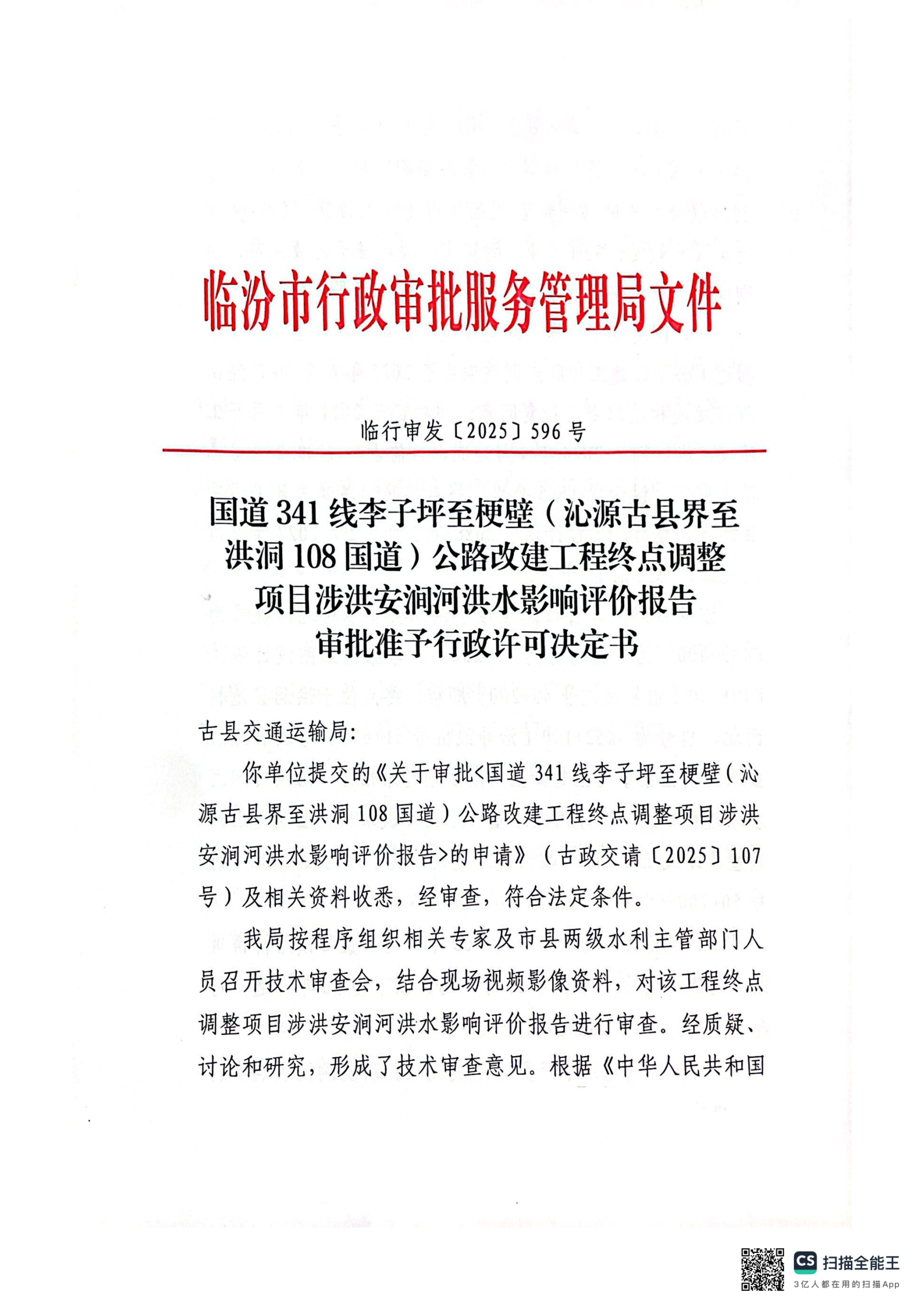 临汾市行政审批服务管理局关于国道341线李子坪至梗壁(沁源古县界至 洪洞108国道)公路改建工程终点调整项目涉洪安涧河洪水影响评价报告审批准予行政许可决定书