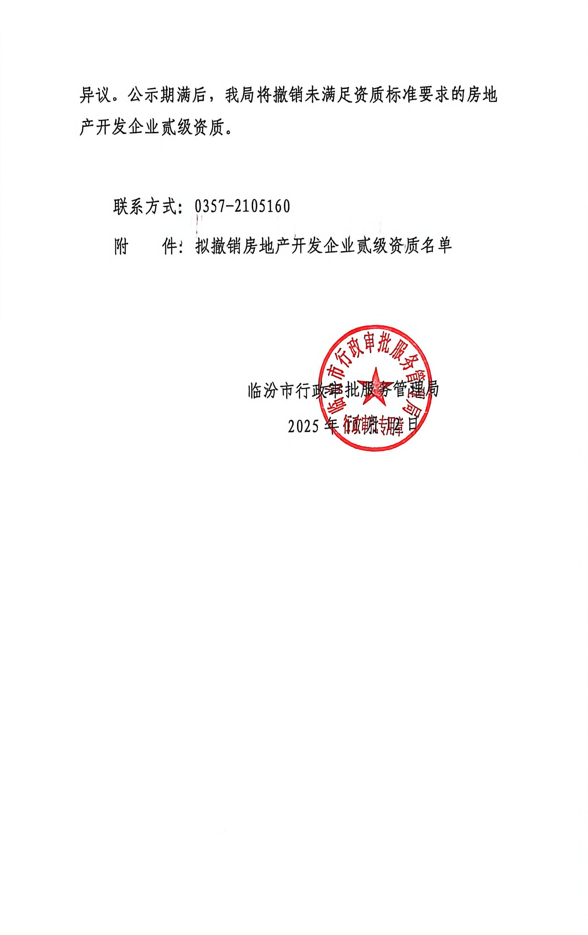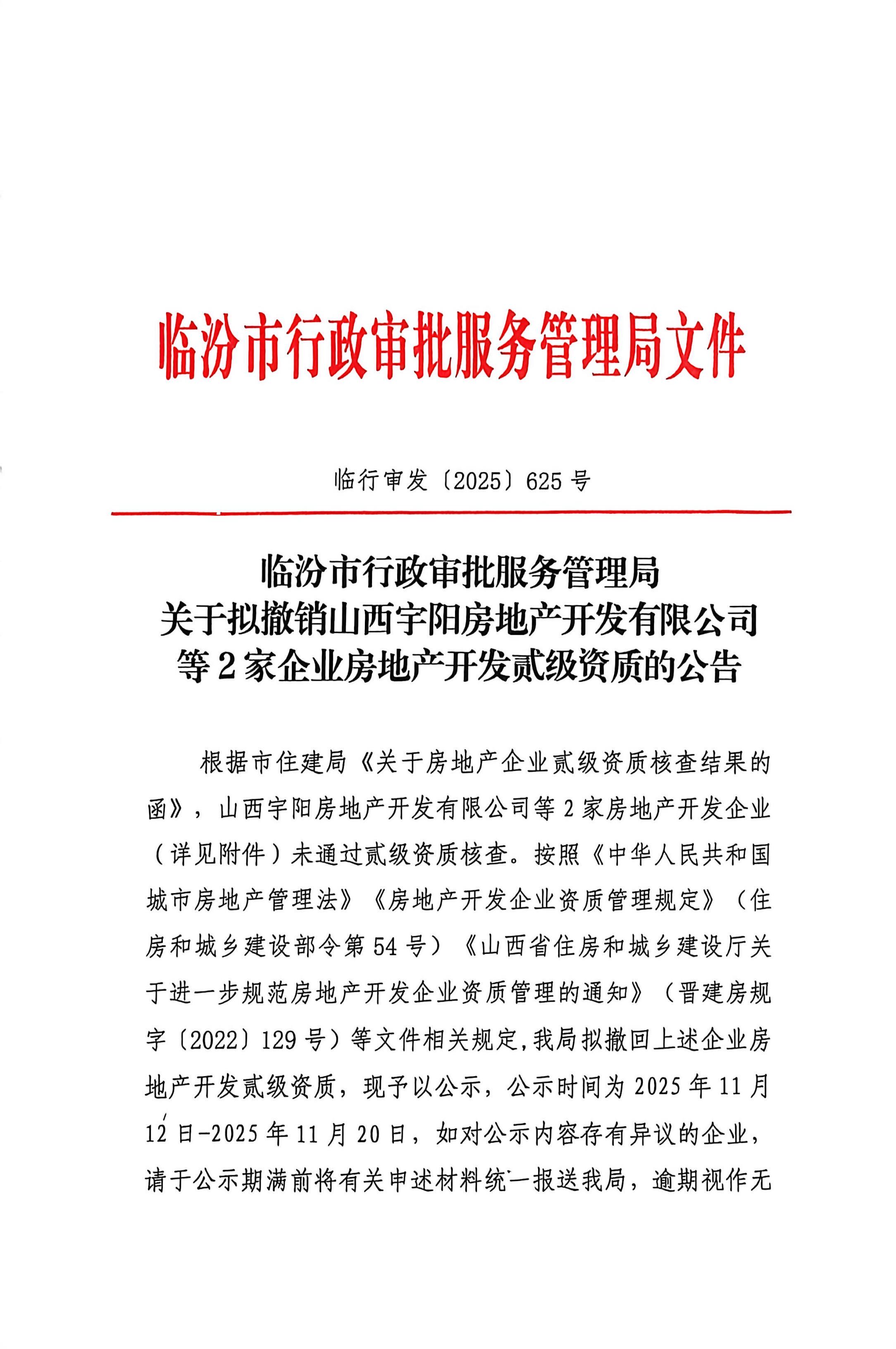 临汾市行政审批服务管理局关于拟撤销山西宇阳房地产开发有限公司等2家企业房地产开发贰级资质的公告