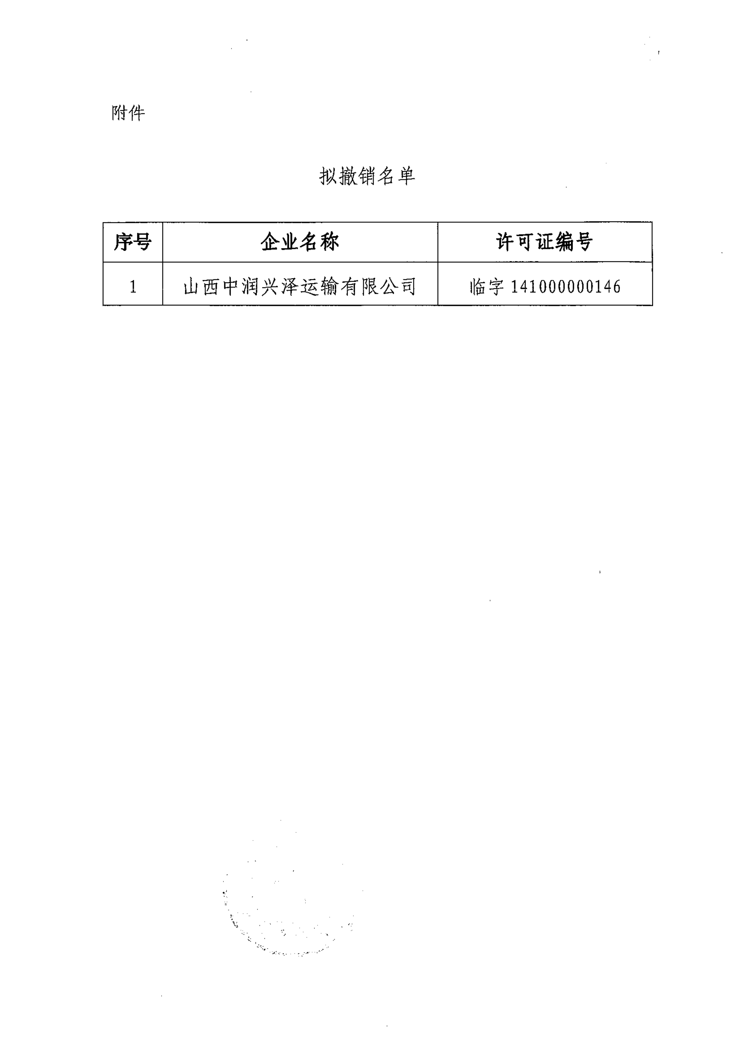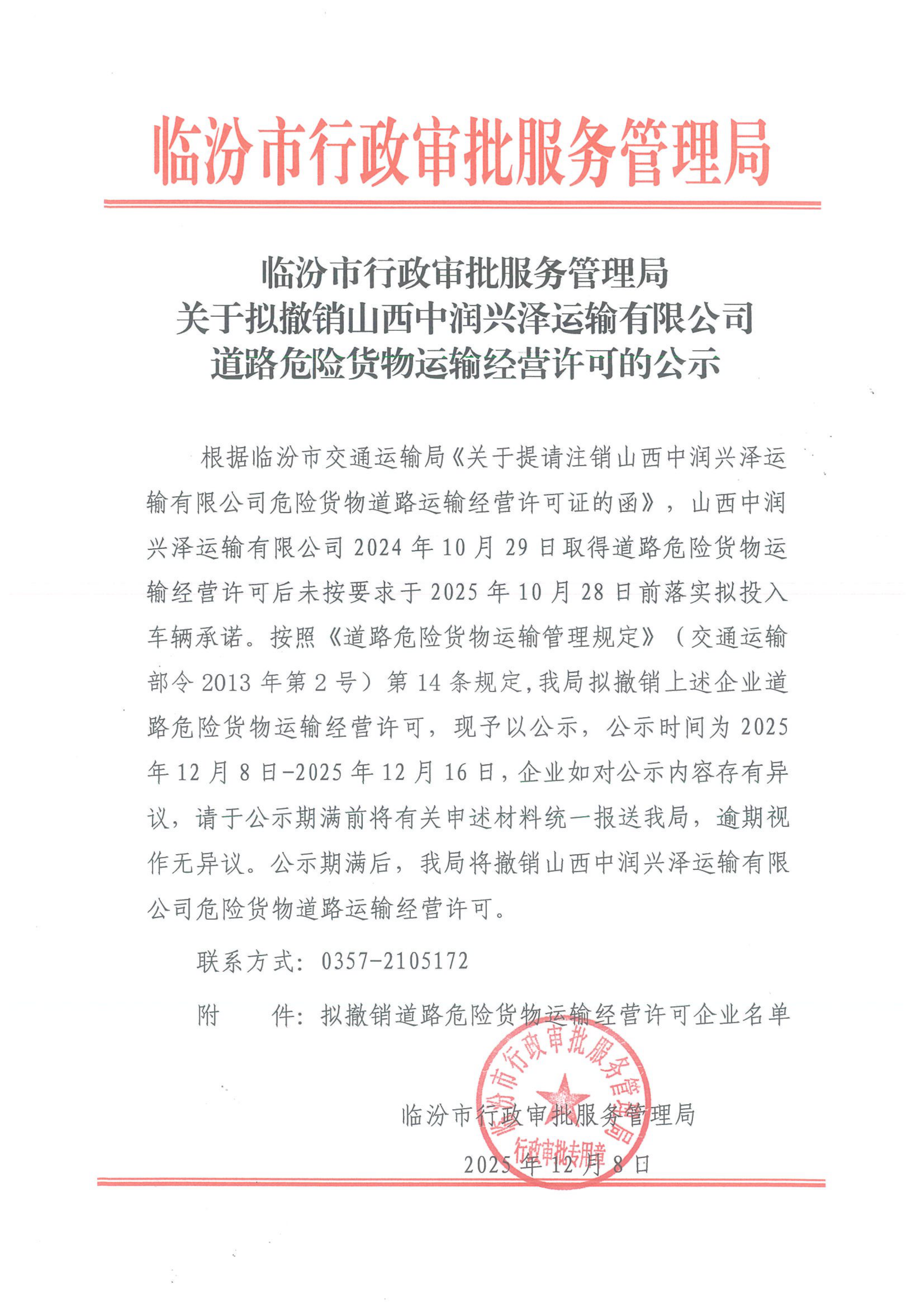 临汾市行政审批服务管理局关于拟撤销山西中润兴泽运输有限公司道路危险货物运输经营许可的公示