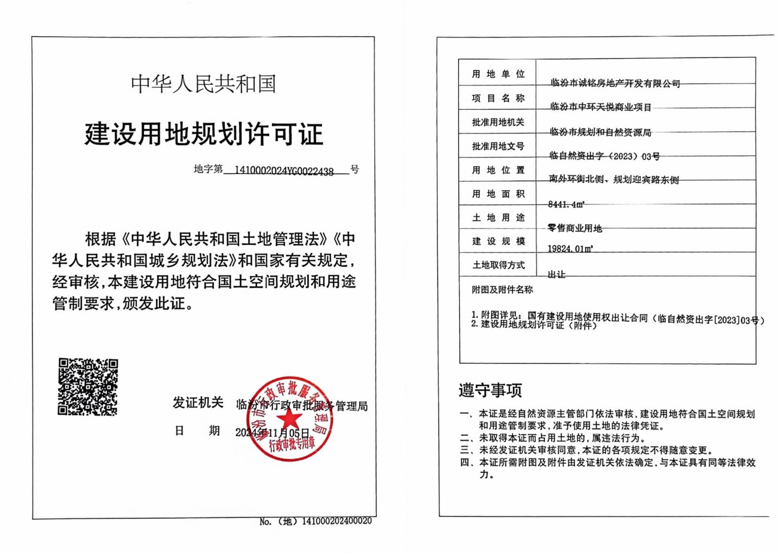 临汾市行政审批服务管理局关于临汾中环天悦商业项目建设用地规划许可批后公开