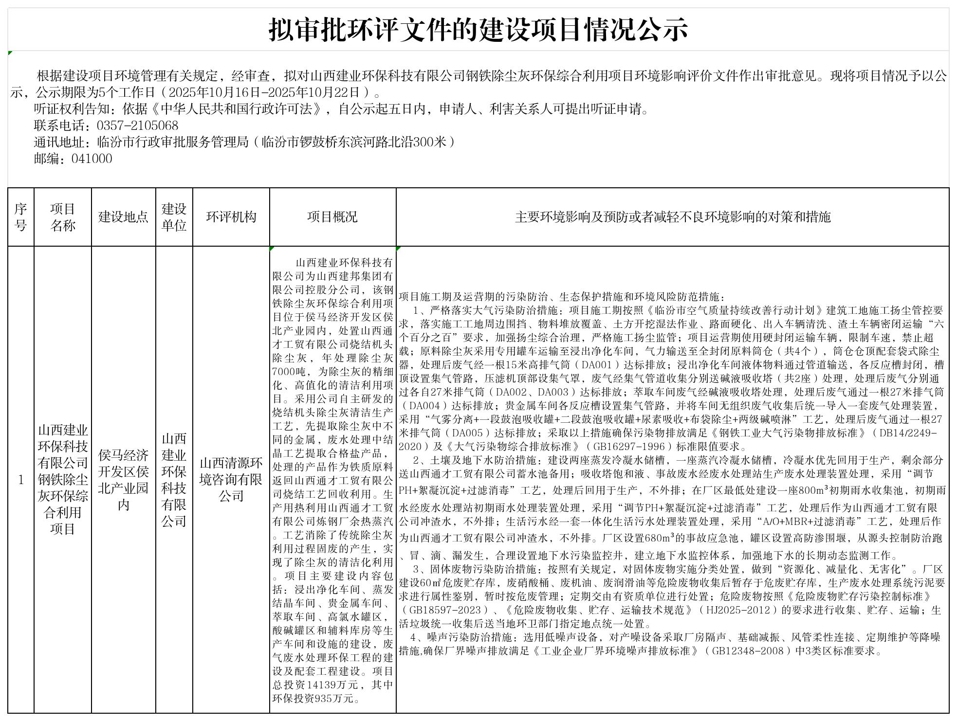 临汾市行政审批服务管理局关于山西建业环保科技有限公司钢铁除尘灰环保综合利用项目拟审批环评文件的建设项目情况公示