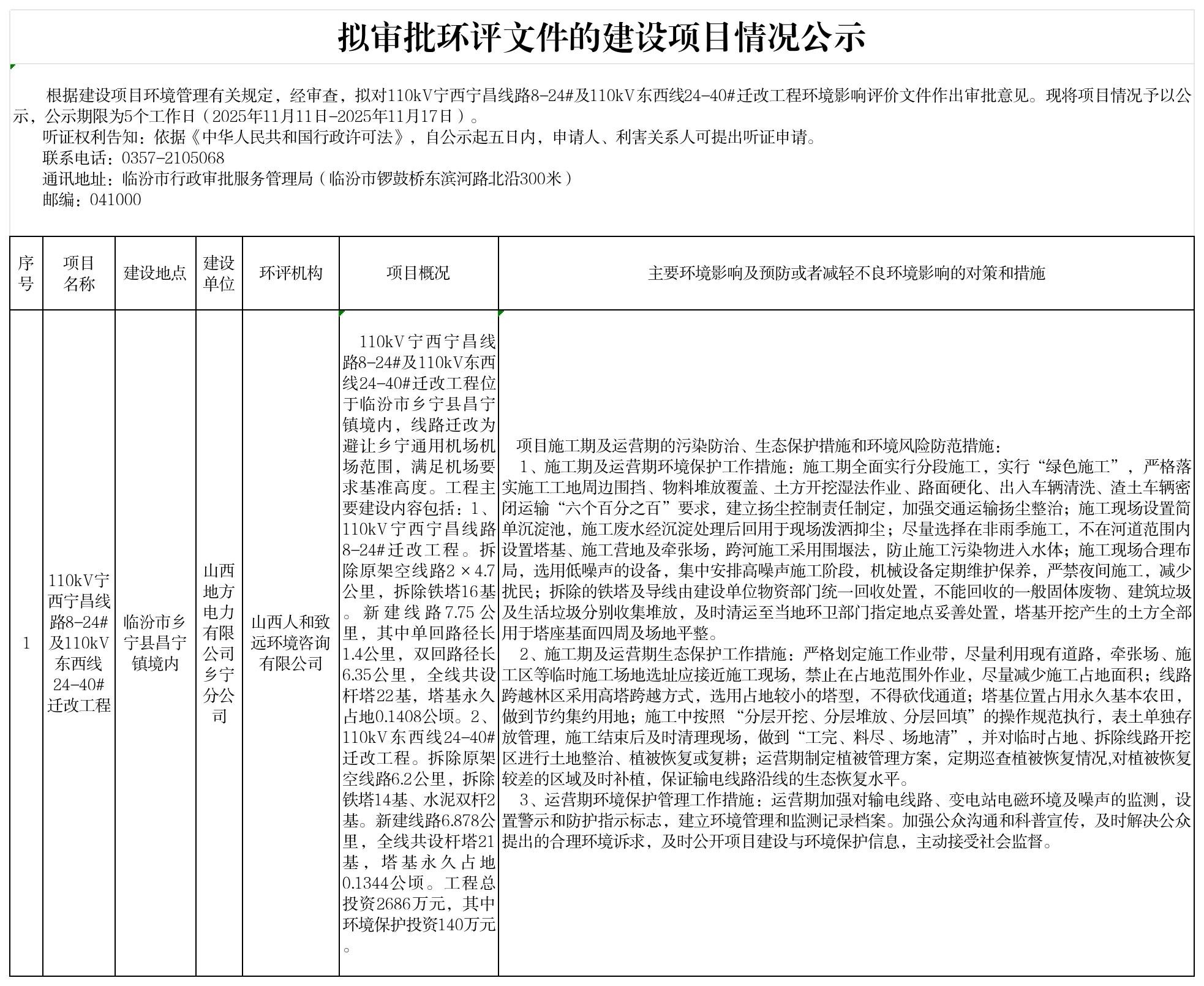 临汾市行政审批服务管理局关于110kV宁西宁昌线路8-24#及110kV东西线24-40#迁改工程拟审批环评文件的建设项目情况公示